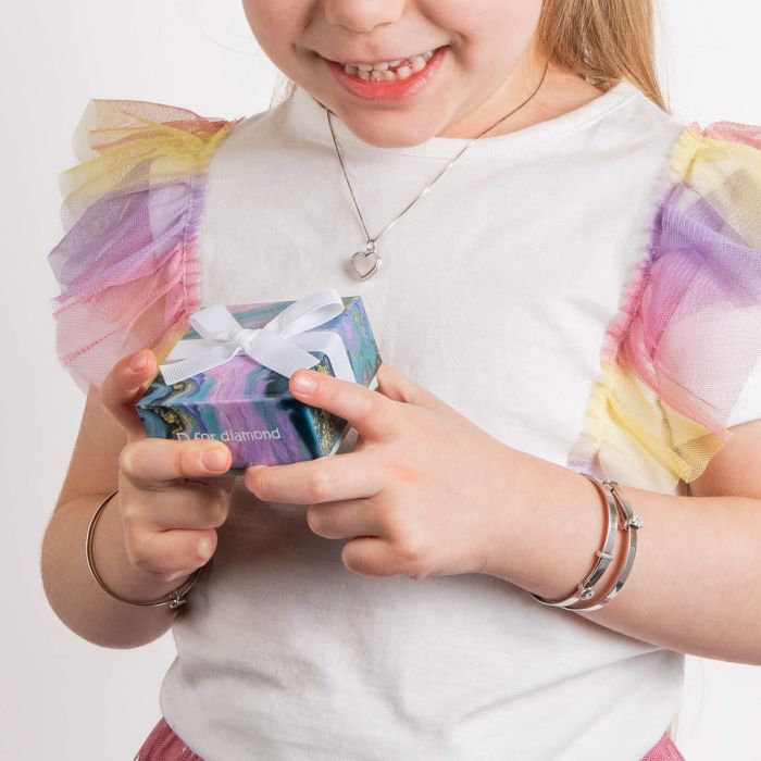 With a cute and sparkling diamond set inside a white enamel daisy, this bangle makes the perfect gift for any little flower girl at a wedding or even a beautiful christening gift. Crafted in recycled sterling silver with a platinum plating, why not add a sentimental engraving like a memorable date or name on the outside or inside of the bangle to make a truly unique keepsake! Pair with the matching earrings to create an adorable co-ordinated look too!