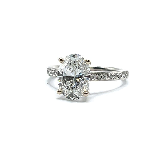 Simply stunning! This classic single stone ring created in 18ct white gold, features the most fabulous eye catching lab grown Diamond. Oval brilliant cut and weighing an impressive 2.29ct.