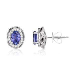 These stunning stud style earrings, created in 9ct white gold, feature a central pair of oval-cut Tanzanite gemstones, enhanced by a sparkling halo of shimmering white Diamonds.