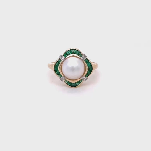 The interplay of the Pearl's soft lustre and the rich green hue of the emeralds creates a timeless elegance. Crafted in 9ct yellow gold, this ring captures vintage char, with modern sophistication.