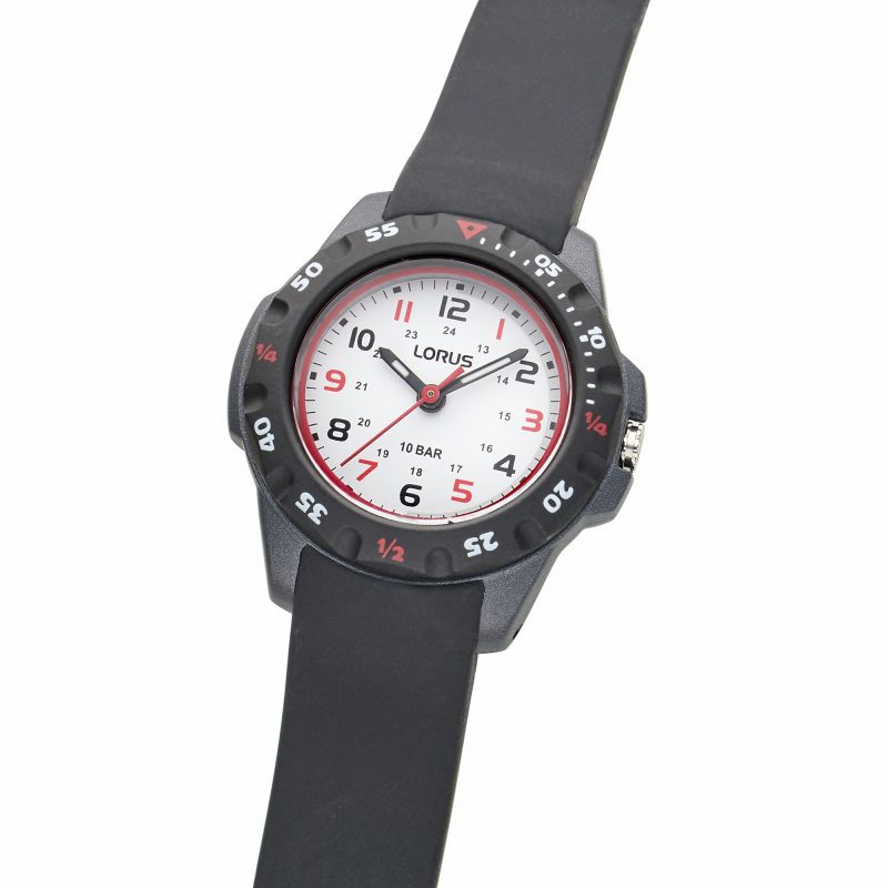 For fun active lifestyles, this Lorus youth time teachers watch combines bold styling and functionality. The striking white dial and red accents on the bezel ensures easy readability for little ones keen to time how long they can hold their breath for and its vibrant colours helps children learn to tell the time. Fitted with a soft silicone strap for ultimate comfort throughout the whole day. With water resistance up to 100 metres, this watch is practical and stylish choice for young explorers.