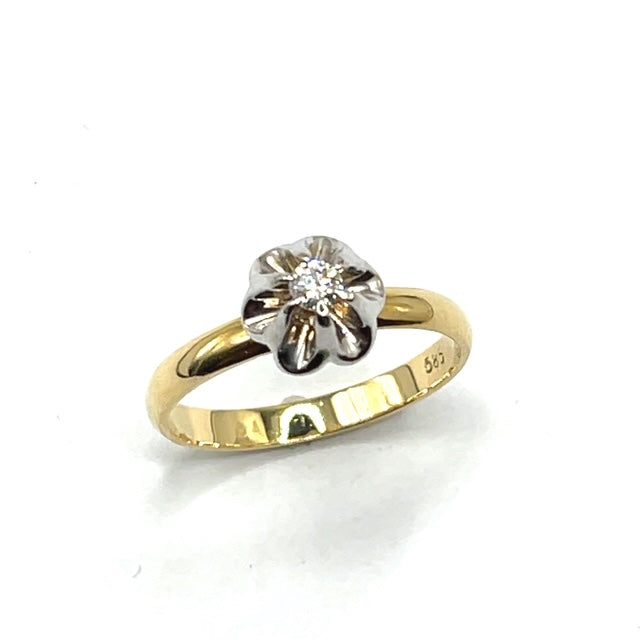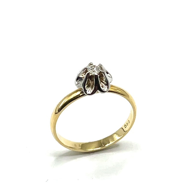 Timeless elegance meets vintage charm in this beautiful secondhand 14ct gold diamond ring. Crafted in warm yellow gold, the band features a distinctive floral-inspired setting that cradles a sparkling round brilliant-cut diamond at its centre. The sculpted white gold mount enhances the brilliance of the diamond while adding subtle contrast and character to the design.