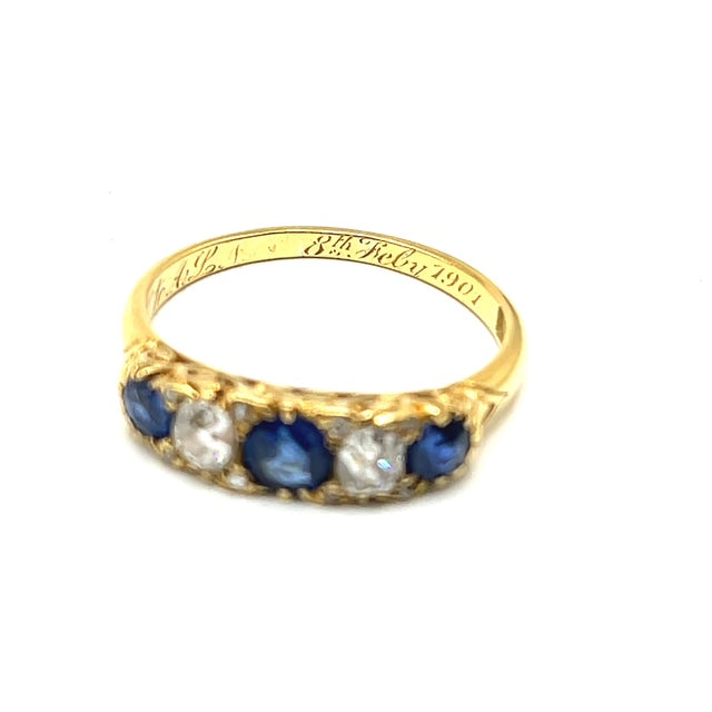 This exquisite antique ring, dated 1901, features a classic five-stone design set with alternating bright Blue Sapphires and sparkling old cut Diamonds. Crafted in rich 18ct yellow gold, the band is adorned with elegant scrollwork detailing and a beautifully engraved inscription inside the shank reading - "W.H.J to A.L.A 8th July 1901"