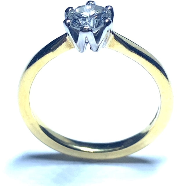 This classic and timeless, single stone ring has been created in 18ct yellow gold. The traditional six claw setting holds a 0.70ct, round brilliant cut Diamond.