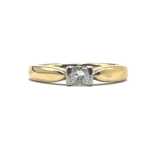 A simple yet striking design, this 18ct gold solitaire ring features a Princess cut Diamond set in a white gold box style setting. The softly tapered yellow band enhances the central Diamond's sparkle, making it a perfect choice for an elegant and timeless engagement ring.