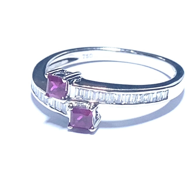 This stunning ring has been created in 18ct white gold and set with a pair of vibrant red, square cut ruby gemstones that are connected to Baguette Diamond cut encrusted shoulders. Modern & fabulous!