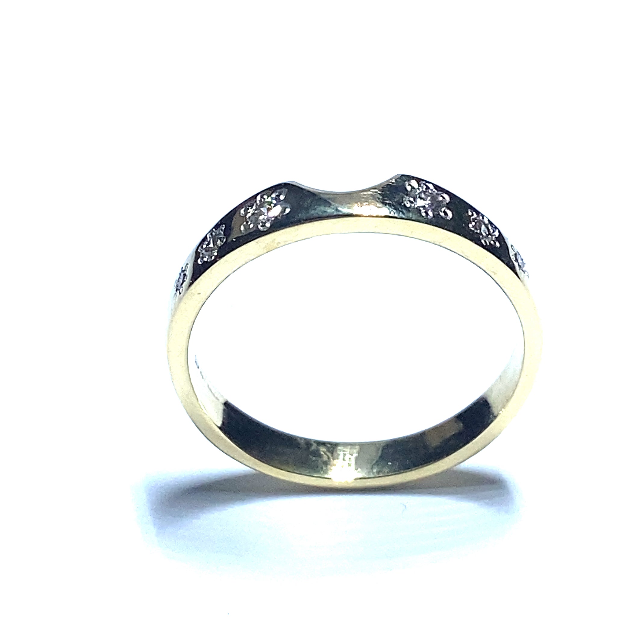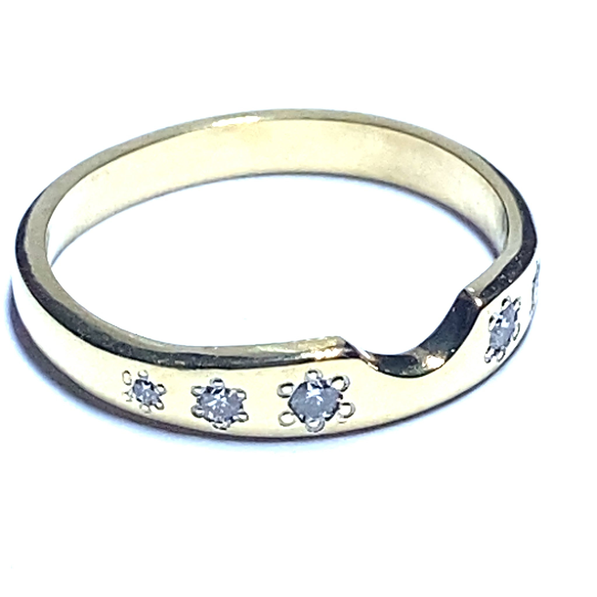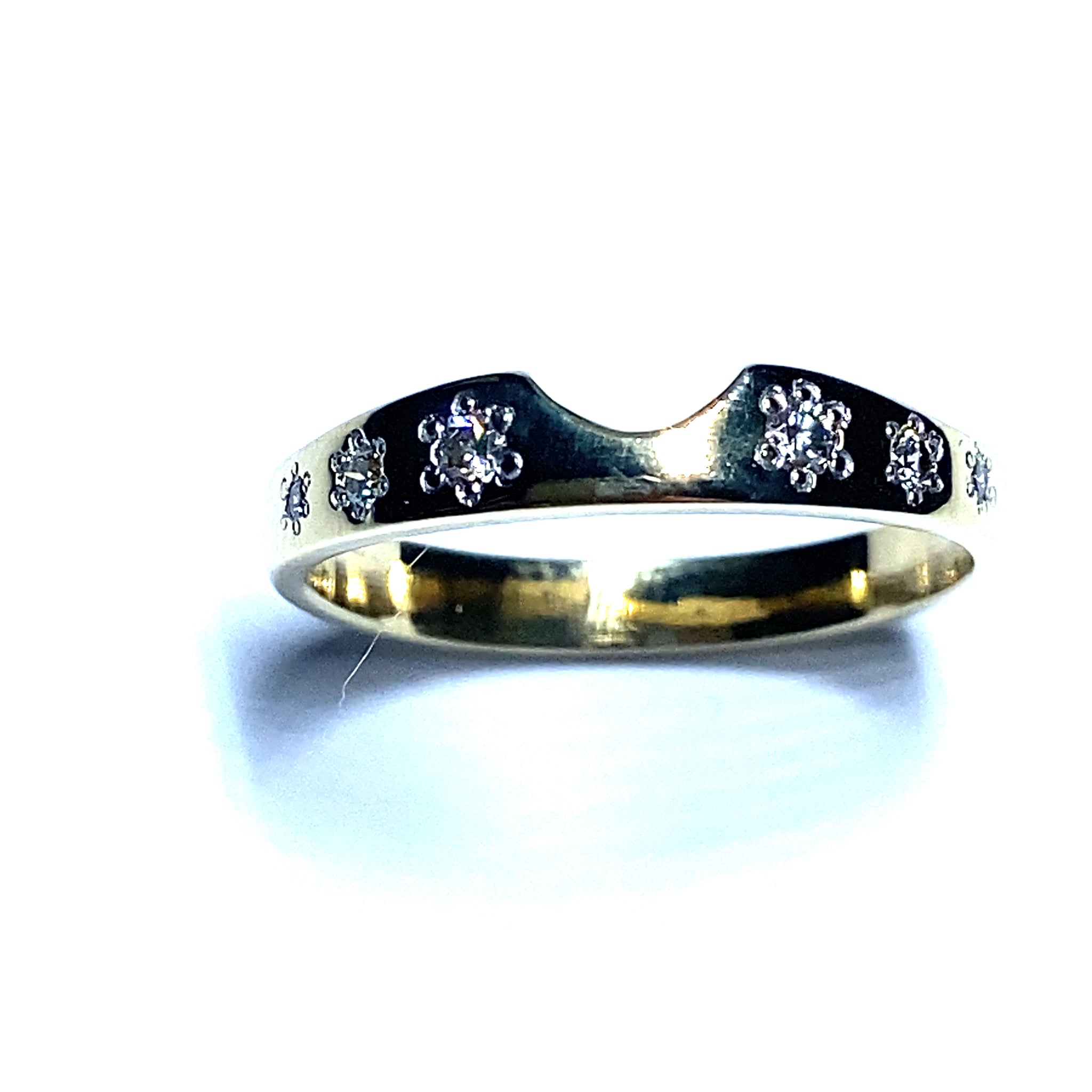 This stunning ring has been created in 18ct yellow gold. The tapered band has been set with six, graduating Diamonds, all in attractive star settings and the cut out, shaped to fit will ensure a good fit against a solitaire or cluster style ring.