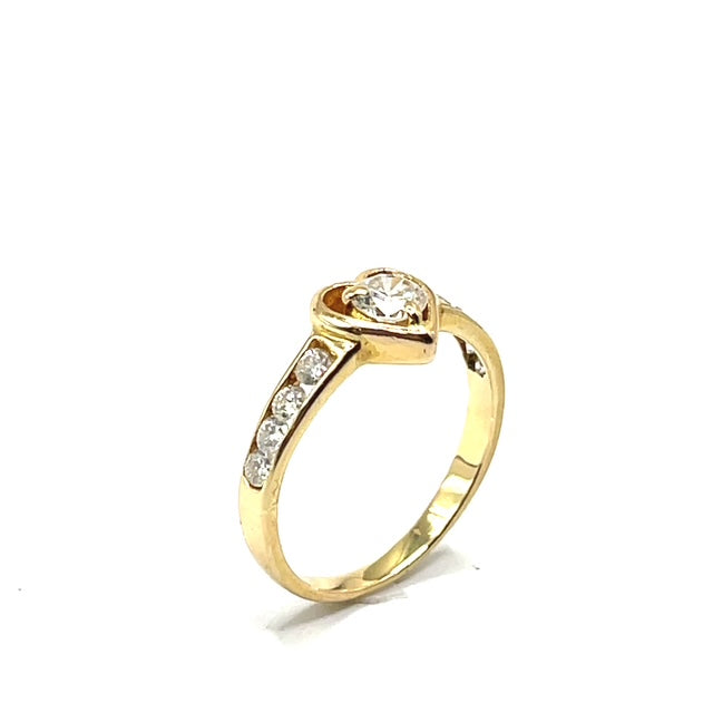 Celebrate love with this elegant 18ct gold diamond heart ring. Crafted in rich yellow gold, the design features a sparkling round brilliant cut diamond nestled at the centre of a polished heart setting, symbolising romance and devotion. Delicate shoulder-set diamonds add extra shimmer, enhancing the ring’s timeless charm. Perfect as a romantic gift, promise ring, or meaningful everyday piece, this beautifully crafted ring is a radiant expression of love.