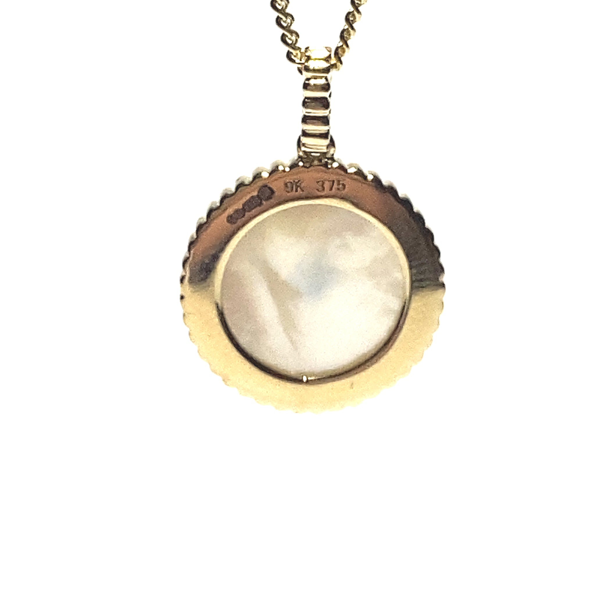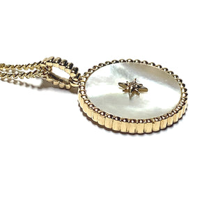 On trend yet classic round pendant. Created in 9ct yellow gold and set with a disc of white Mother of Pearl and a single diamond in the centre.