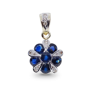 Stunning pendant created in 9ct yellow gold. The flower cluster design is set with some fabulous blue Sapphires and the diamond accents add a touch of shimmer.