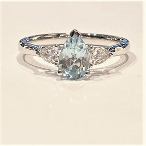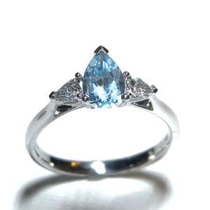Stunning and elegant ring featuring a beautiful sky blue, pear cut Topaz that is flanked by a pair of pear cut, dazzling white Diamonds. The 9ct white gold setting has been made as a 'wedd-fit; design to ensure a snig fit against straight edged wedding or eternity rings.